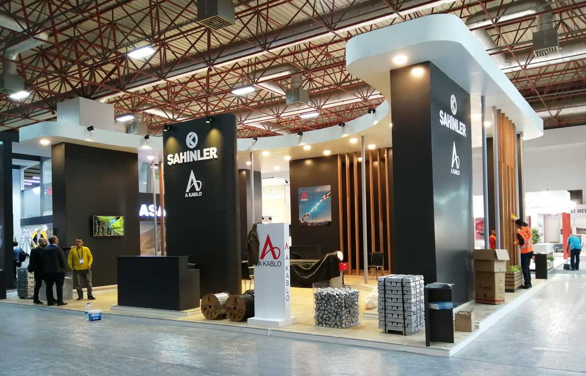 Sahinler Metal Group is one of Turkey's largest metal and steel manufacturers specialising in steel slabs, pipes and cables. They approached us for a 12x7m exhibition stand at the 2nd organisation of the International Metal Expo Istanbul. They briefed us with large stand dimensions in which they asked for a modern and contemporary design that emphasised their character as a noble manufacturer in the industry. In this trade show, they wanted to promote one of their sub-brands which is A Cables. They’re manufacturing high-quality outdoor steel cables to be used in the high voltage lines that are carrying electricity to homes and facilities. A Cables is still under the management of Sahinler Metal but for this exhibition event, their objective was to focus on A Cables solely to promote them in the new emerging market.