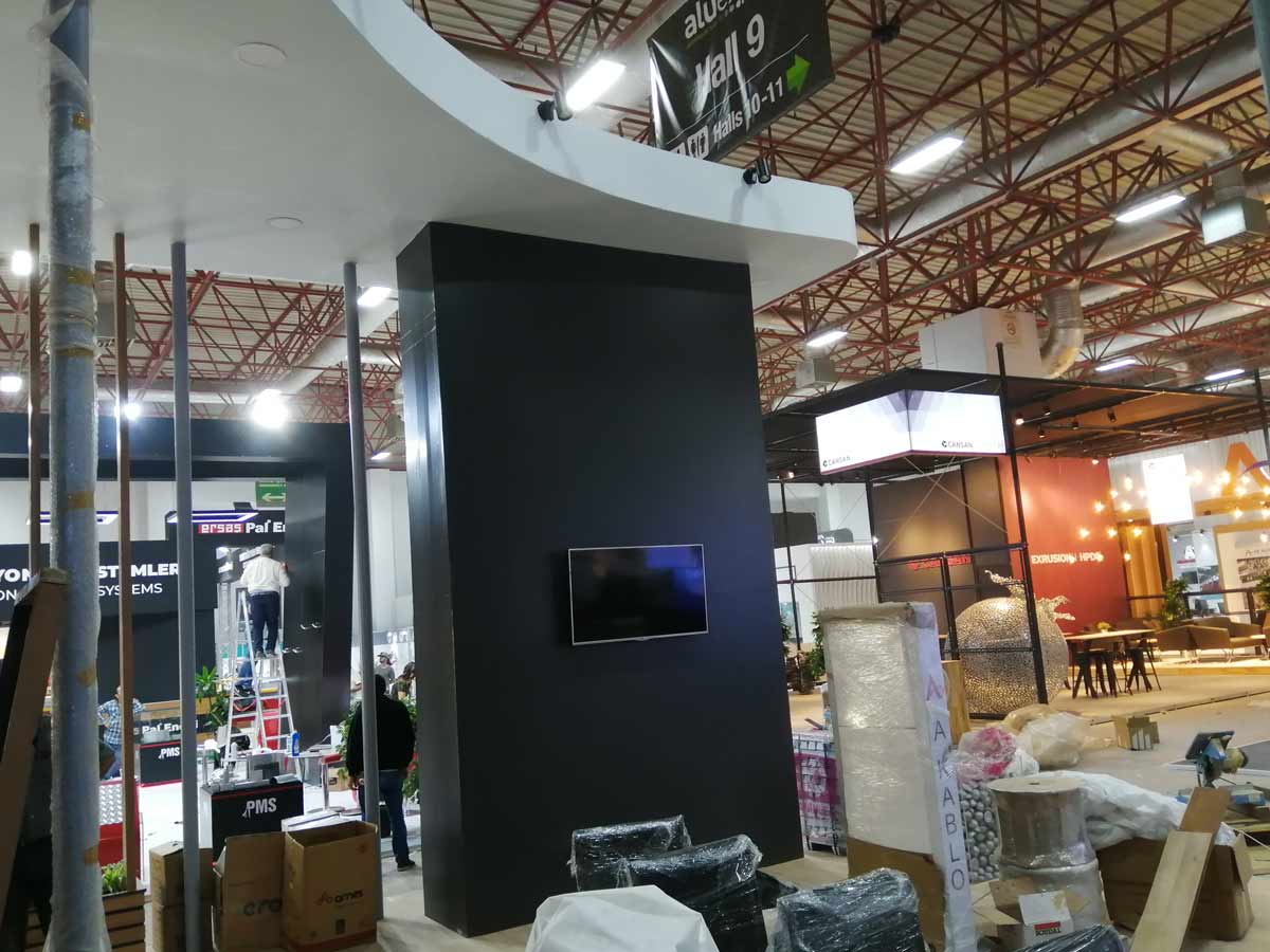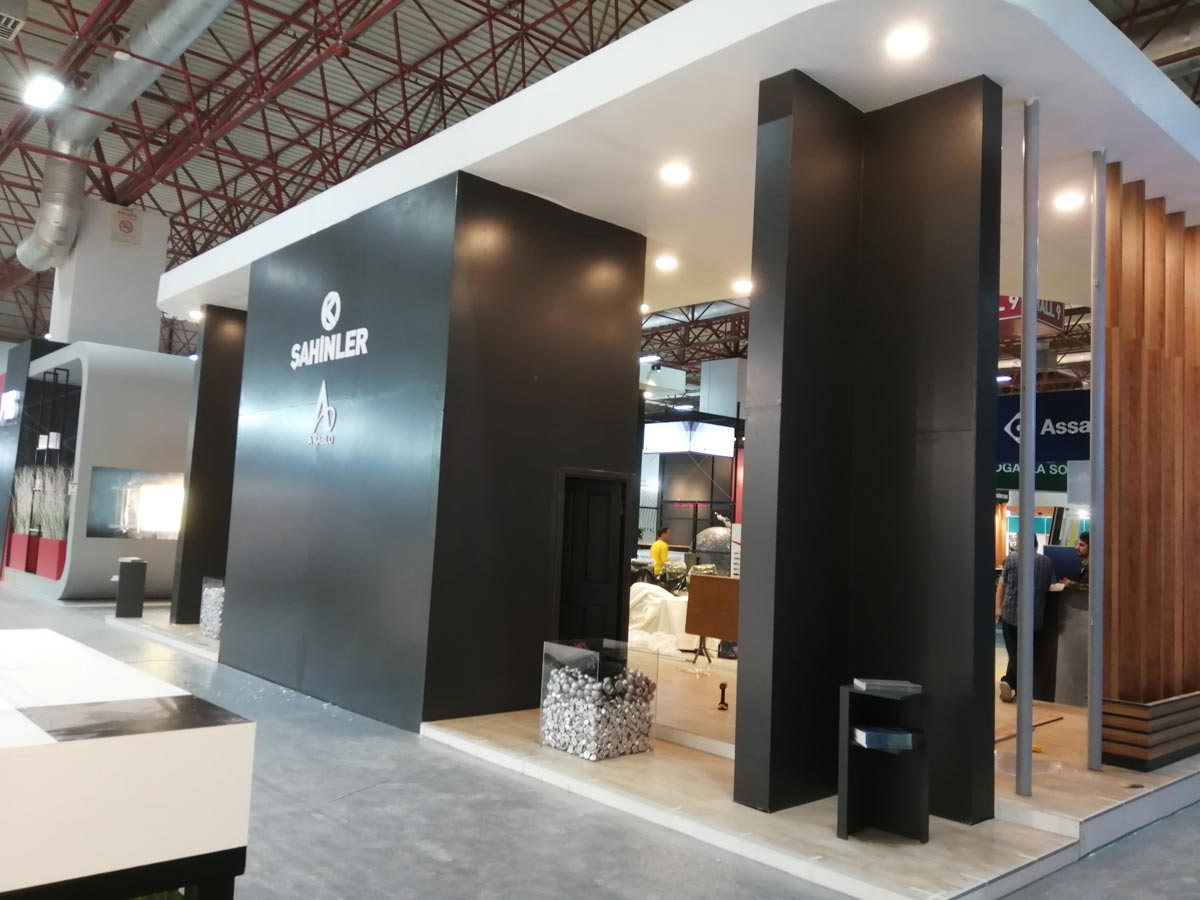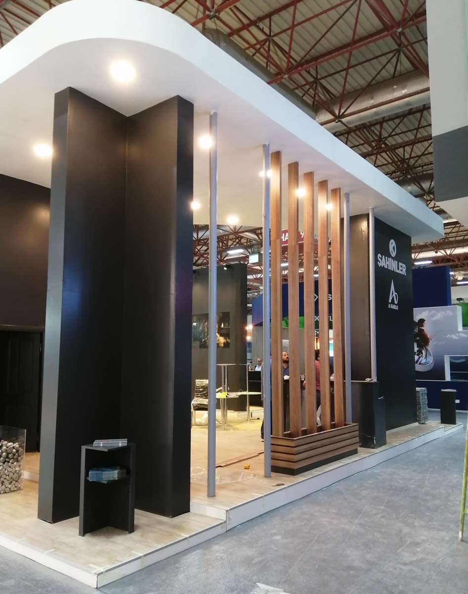 Sahinler’s corporate colours are mainly red and white. We moved away from those hues to emphasise the difference in maintaining their holdings company logo just under A cables. Ultimately we wanted to go for a dark warm grey that could also work with white and wood tones which we later added wooden pillars to compliment the design and used as separators. This way we also gained a warm contrasting structure in turning corners of the exhibition stand. We supported those pillars with sahinler’s own sturdy metal pipes. Our objective was to create an open, sort of hugging form that embraced the visitors and enhanced the height of the exhibition stand. We placed huge cable rolls, metal slabs and dice samples, products from Sahinler Metal. Placing raw materials like those in such a neat and modern exhibition stand made them stand out and created a very interesting decor for the rest of the stand. In the far back corners, we shaped the columns in opposite triangles. This allowed more room into the stand and we put a catalogue holder for the visitors walking behind the stand.